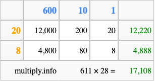 That's all there is to it! As you can see from the box above, the answer to 611 times 28 using the box method is 17,108.
