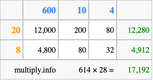 That's all there is to it! As you can see from the box above, the answer to 614 times 28 using the box method is 17,192.