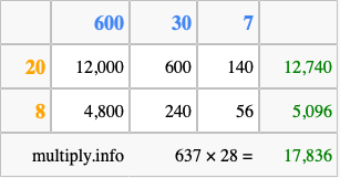 Below is an illustration showing you how to calculate 637 times 28 using the box method, using the instructions above.