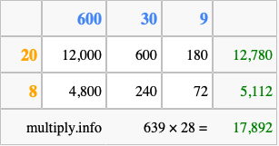 Finally, we add up all the sums we found in step 3 to get our final answer to 639 times 28.
