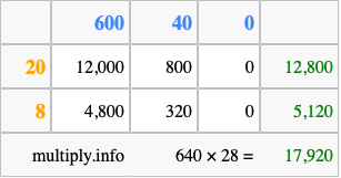 That's all there is to it! As you can see from the box above, the answer to 640 times 28 using the box method is 17,920.