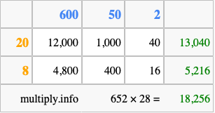 That's all there is to it! As you can see from the box above, the answer to 652 times 28 using the box method is 18,256.
