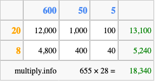 Finally, we add up all the sums we found in step 3 to get our final answer to 655 times 28.