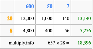 Finally, we add up all the sums we found in step 3 to get our final answer to 657 times 28.