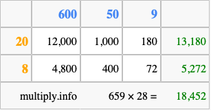 Finally, we add up all the sums we found in step 3 to get our final answer to 659 times 28.