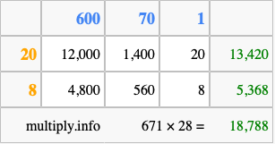 That's all there is to it! As you can see from the box above, the answer to 671 times 28 using the box method is 18,788.
