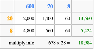 Finally, we add up all the sums we found in step 3 to get our final answer to 678 times 28.