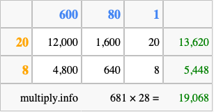 Finally, we add up all the sums we found in step 3 to get our final answer to 681 times 28.