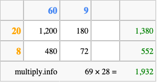 That's all there is to it! As you can see from the box above, the answer to 69 times 28 using the box method is 1,932.