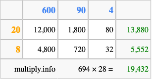 Finally, we add up all the sums we found in step 3 to get our final answer to 694 times 28.