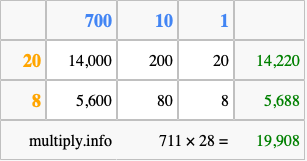 Below is an illustration showing you how to calculate 711 times 28 using the box method, using the instructions above.