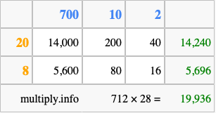 Below is an illustration showing you how to calculate 712 times 28 using the box method, using the instructions above.