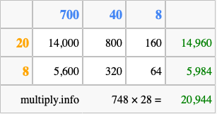 That's all there is to it! As you can see from the box above, the answer to 748 times 28 using the box method is 20,944.