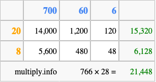 Finally, we add up all the sums we found in step 3 to get our final answer to 766 times 28.