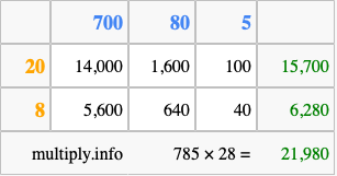 Finally, we add up all the sums we found in step 3 to get our final answer to 785 times 28.
