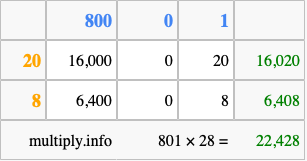 That's all there is to it! As you can see from the box above, the answer to 801 times 28 using the box method is 22,428.