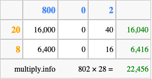 Finally, we add up all the sums we found in step 3 to get our final answer to 802 times 28.