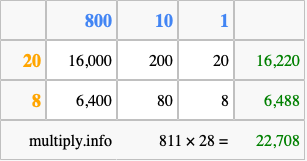 Finally, we add up all the sums we found in step 3 to get our final answer to 811 times 28.