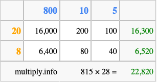 Finally, we add up all the sums we found in step 3 to get our final answer to 815 times 28.