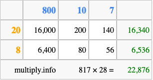 Finally, we add up all the sums we found in step 3 to get our final answer to 817 times 28.