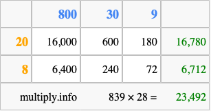 Finally, we add up all the sums we found in step 3 to get our final answer to 839 times 28.