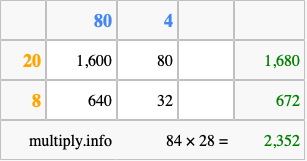 Finally, we add up all the sums we found in step 3 to get our final answer to 84 times 28.