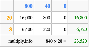 That's all there is to it! As you can see from the box above, the answer to 840 times 28 using the box method is 23,520.