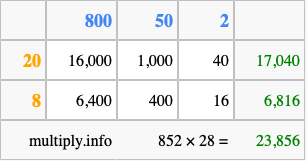 Finally, we add up all the sums we found in step 3 to get our final answer to 852 times 28.