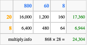 Finally, we add up all the sums we found in step 3 to get our final answer to 868 times 28.