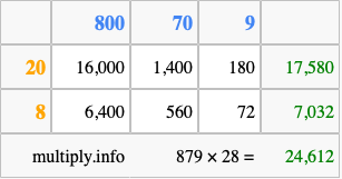 Finally, we add up all the sums we found in step 3 to get our final answer to 879 times 28.