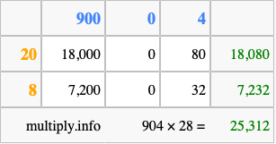 Finally, we add up all the sums we found in step 3 to get our final answer to 904 times 28.