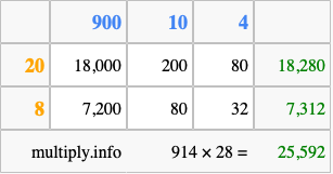 Finally, we add up all the sums we found in step 3 to get our final answer to 914 times 28.