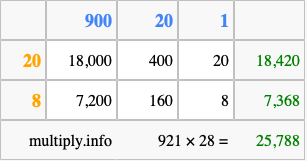 That's all there is to it! As you can see from the box above, the answer to 921 times 28 using the box method is 25,788.