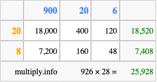 That's all there is to it! As you can see from the box above, the answer to 926 times 28 using the box method is 25,928.