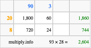 Finally, we add up all the sums we found in step 3 to get our final answer to 93 times 28.