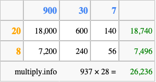 That's all there is to it! As you can see from the box above, the answer to 937 times 28 using the box method is 26,236.