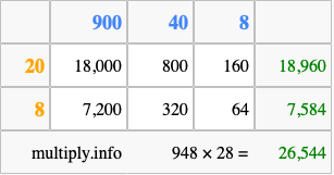 That's all there is to it! As you can see from the box above, the answer to 948 times 28 using the box method is 26,544.