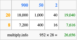 That's all there is to it! As you can see from the box above, the answer to 952 times 28 using the box method is 26,656.