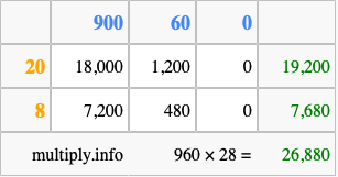 That's all there is to it! As you can see from the box above, the answer to 960 times 28 using the box method is 26,880.