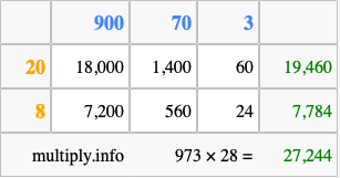 That's all there is to it! As you can see from the box above, the answer to 973 times 28 using the box method is 27,244.