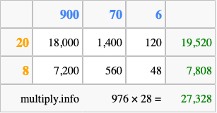 That's all there is to it! As you can see from the box above, the answer to 976 times 28 using the box method is 27,328.