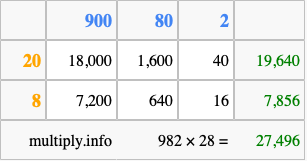 Finally, we add up all the sums we found in step 3 to get our final answer to 982 times 28.