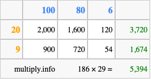 Finally, we add up all the sums we found in step 3 to get our final answer to 186 times 29.