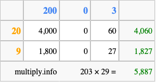 That's all there is to it! As you can see from the box above, the answer to 203 times 29 using the box method is 5,887.