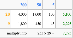 That's all there is to it! As you can see from the box above, the answer to 255 times 29 using the box method is 7,395.