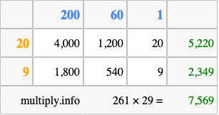 Finally, we add up all the sums we found in step 3 to get our final answer to 261 times 29.