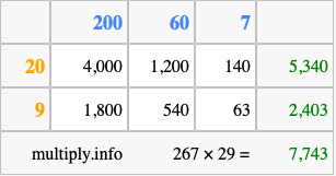 That's all there is to it! As you can see from the box above, the answer to 267 times 29 using the box method is 7,743.