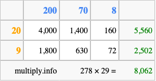 That's all there is to it! As you can see from the box above, the answer to 278 times 29 using the box method is 8,062.