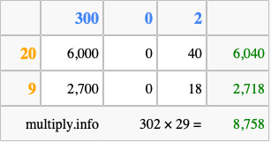 That's all there is to it! As you can see from the box above, the answer to 302 times 29 using the box method is 8,758.