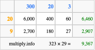 Finally, we add up all the sums we found in step 3 to get our final answer to 323 times 29.